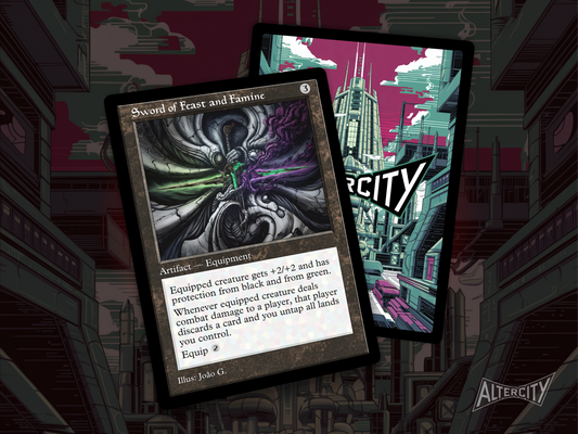 Strike with precision and control using this custom Sword of Feast and Famine Magic: The Gathering proxy card, featuring bold, altered art that enhances its legendary...